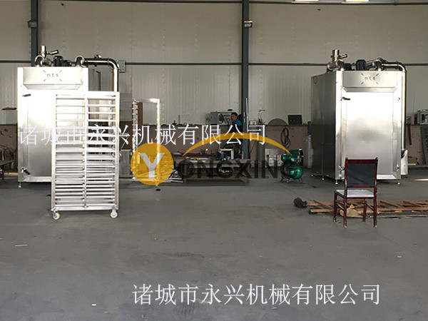 蒸煮部分:爐體內部設計自動產生蒸氣系統,對爐內產品直接加熱。蒸汽的產量可根據不同的產品進行調節。箱體內壓力不允許超過0.08Mpa。